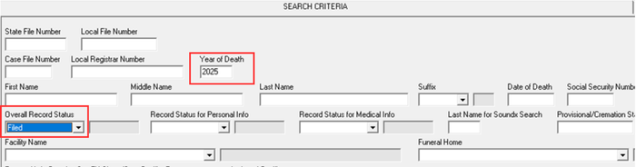 You can search for any unregistered records in EDRS by entering the “Year of Death” as 2025 and filtering the “Overall Record Status” by pending, filed and complete.